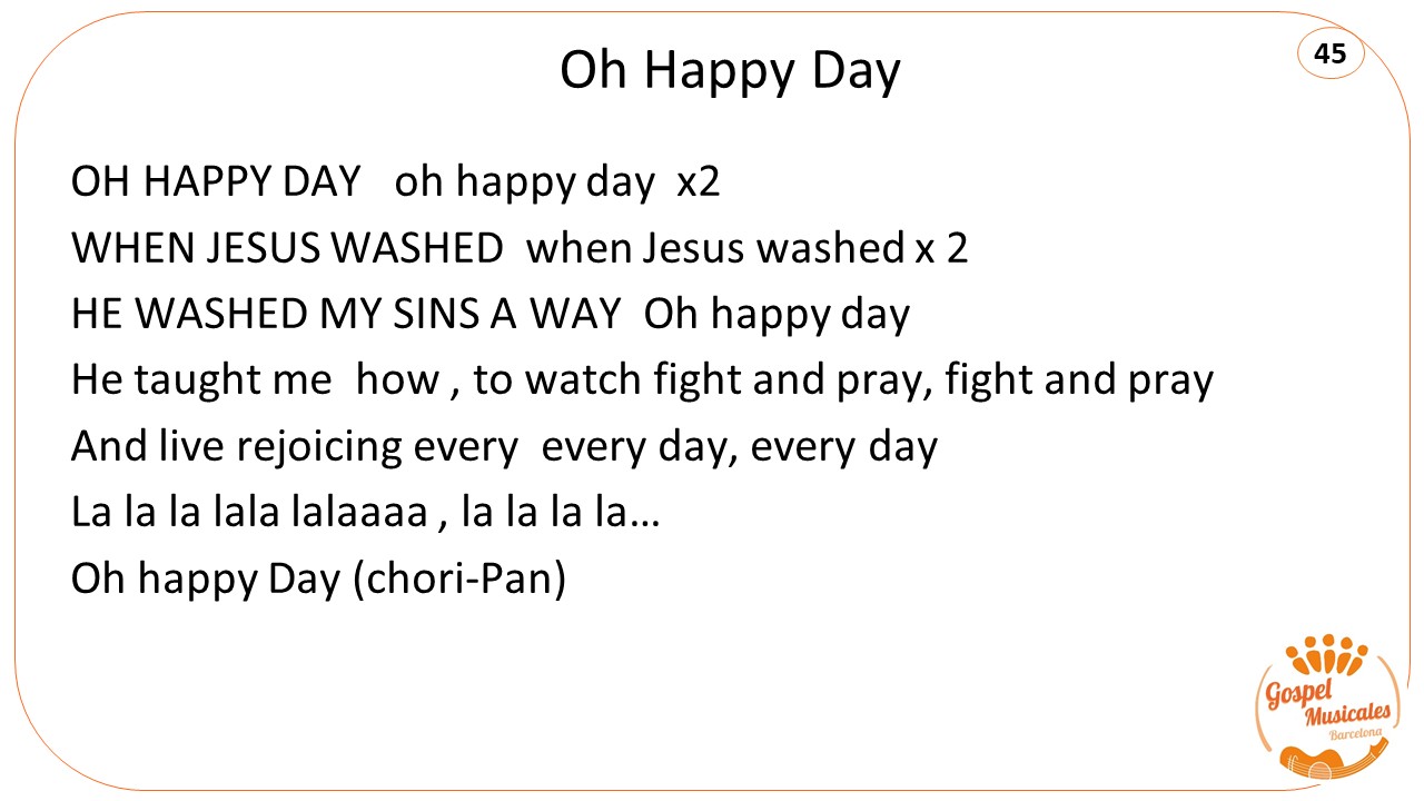 OH HAPPY DAY oh happy day x2 WHEN JESUS WASHED when Jesus washed x 2 HE WASHED MY SINS A WAY Oh happy day He taught me how , to watch fight and pray, fight and pray And live rejoicing every every day, every day La la la lala lalaaaa , la la la la…